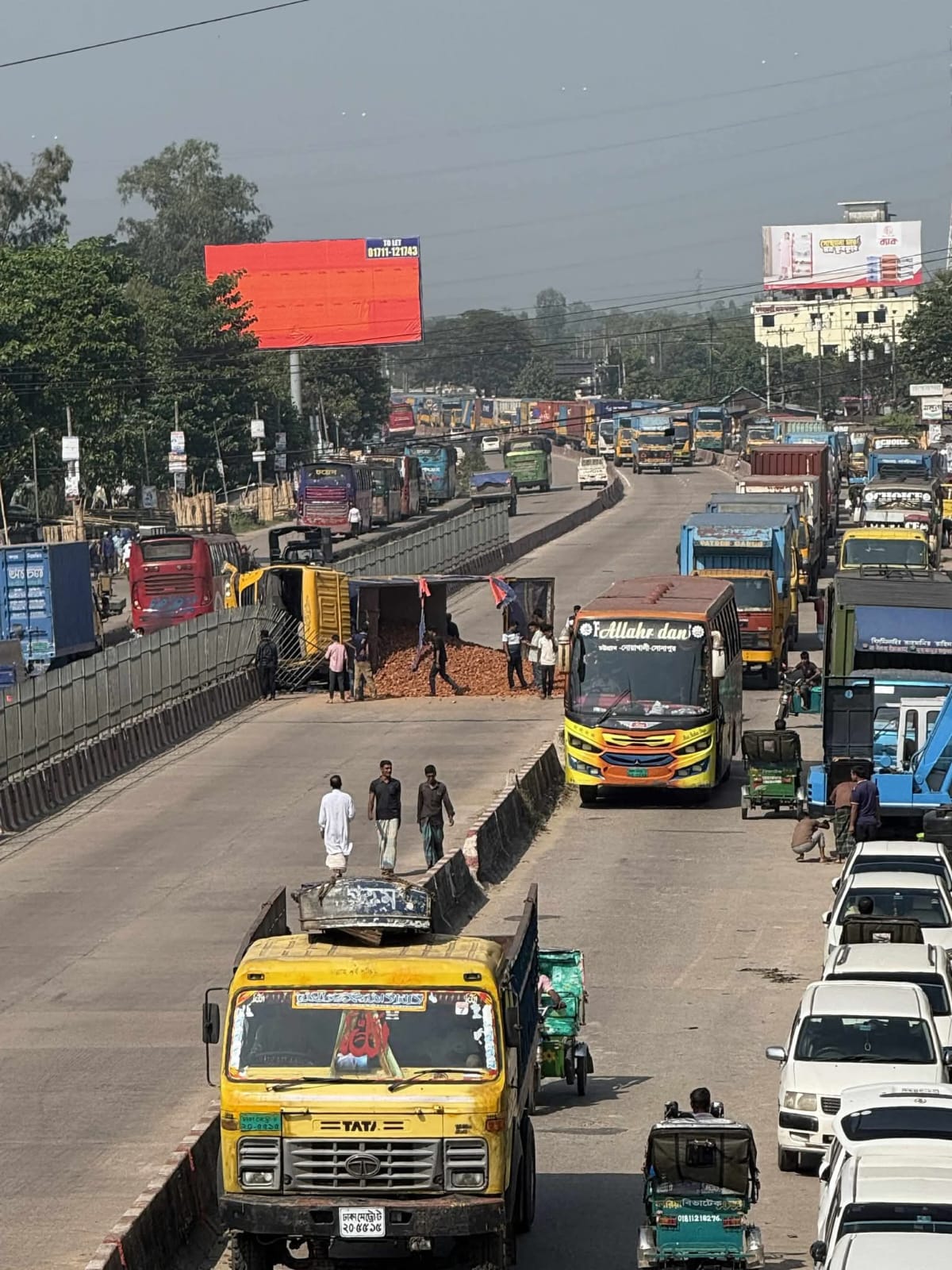 কংক্রিট সহ ট্রাক উল্টে ঢাকা চট্টগ্রাম মহাসড়ক যানজট